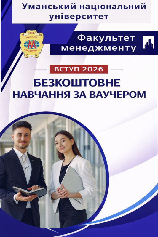 Уманський національний університет запрошує всіх охочих скористатися державною програмою «Ваучер на навчання» та здобути престижну професію або другу вищу освіту на факультеті менеджменту.