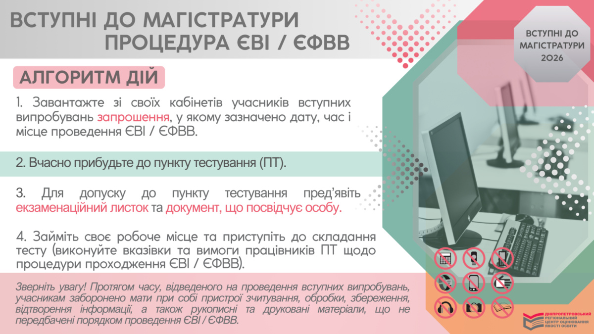 У 2026 році для вступу на освітній рівень «Магістр» передбачено складання єдиного вступного іспиту (ЄВІ) та єдиного фахового вступного випробування (ЄФВВ) відповідно до проєкту Порядку прийому на навчання для здобуття вищої освіти.