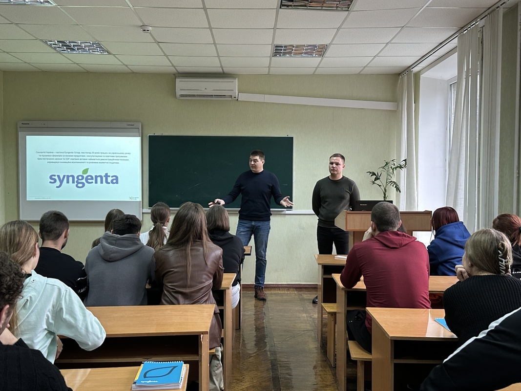 На факультеті менеджменту відбулася зустріч студентів із представниками компанії «Syngenta» – Бовкуном Дмитром Олександровичем, спеціалістом з розвитку технологій внесення продуктів, та Коржем Антоном Вікторовичем, регіональним менеджером з маркетингу.